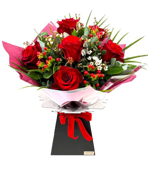6 Roses, gift wrapped with foliage and presented in a box aqua packed.