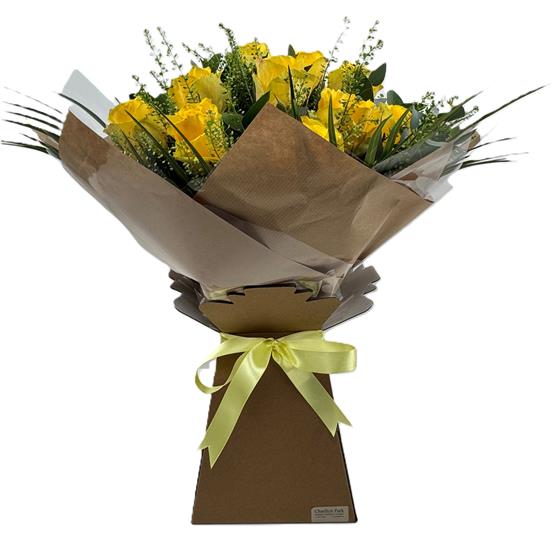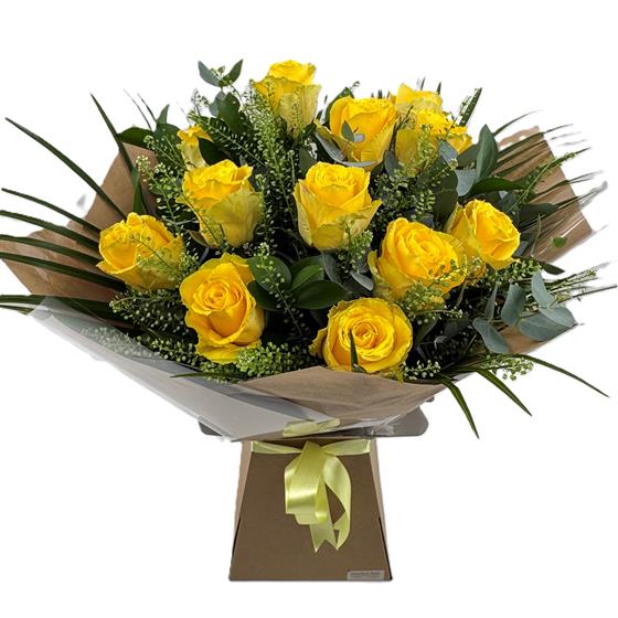 A handtied aqua bouquet of 12 Beautiful Yellow roses complimented with foliage.