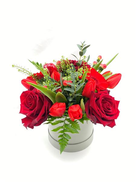 Stunning in design, this Valentine's Day flower hatbox arrangment features striking red roses, bloom chrysanthemum and mini gerberas.