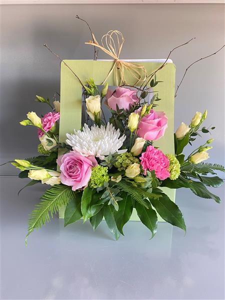 Front facing arrangement in a cardboard carrier as a florist choice.